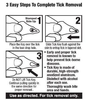 Place the key over the tick in the slot. Pull key away from the tick sliding flush along the skin. The Tick is removed easily, head and all! This design has been perfected and tested for over a decade and is responsible for the removal of thousands and thousands of ticks of all sizes (including deer ticks and dog ticks). Original TickKey™ is fabricated from high-strength anodized aluminum… this is not a weak piece of plastic.